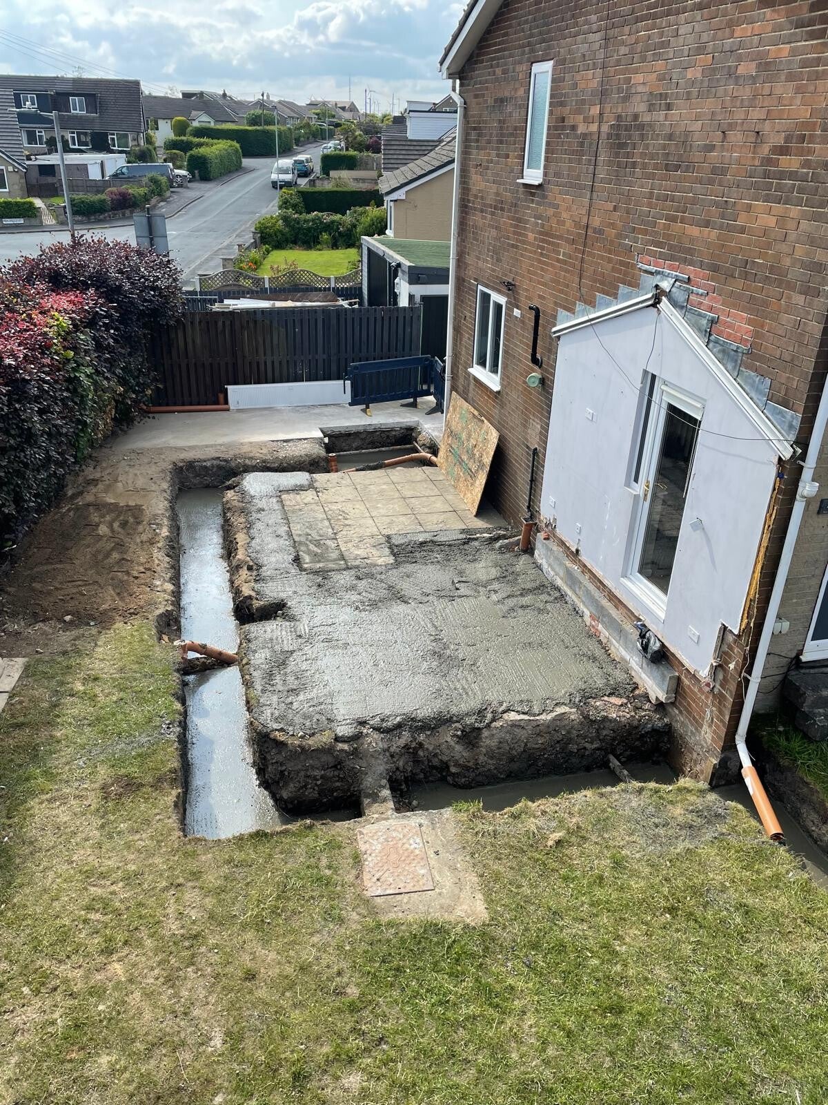Footings and drainage installed in Bradford for a side extension. A concrete layer was spread over the ground inside the extension to act as an oversite in order to stop any growth and act as hardstanding, protecting from wet weather for following trades.