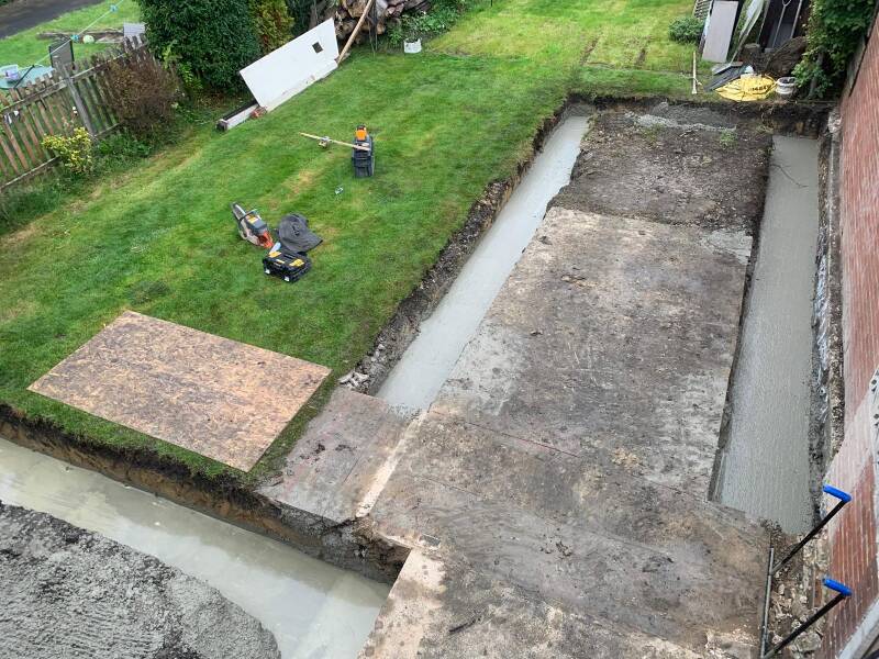 Footings for a rear extension and a new garage were needed for this project along with some top water drainage and a land drain for a sodden lawn.